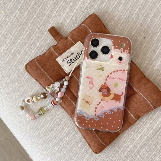 Puppy-Themed Phone Case Pastel Café-core With A Beaded Charm Strap