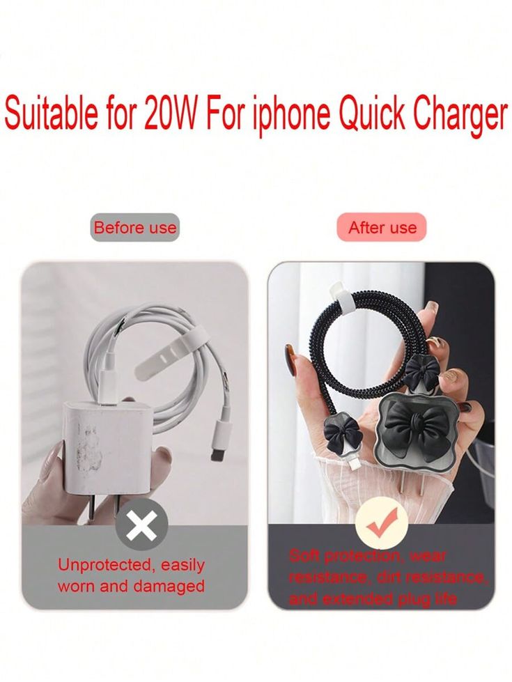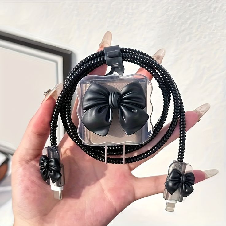 A cute cartoon-themed fast charger protector with a black bow design for iPhone would make a stylish and chic accessory! These protectors are usually made from soft silicone, providing durability while adding a bit of flair to your charger. The black bow detail could be a subtle yet elegant touch, often paired with either minimalistic backgrounds or a cute character motif in neutral or pastel colors to make the bow stand out.